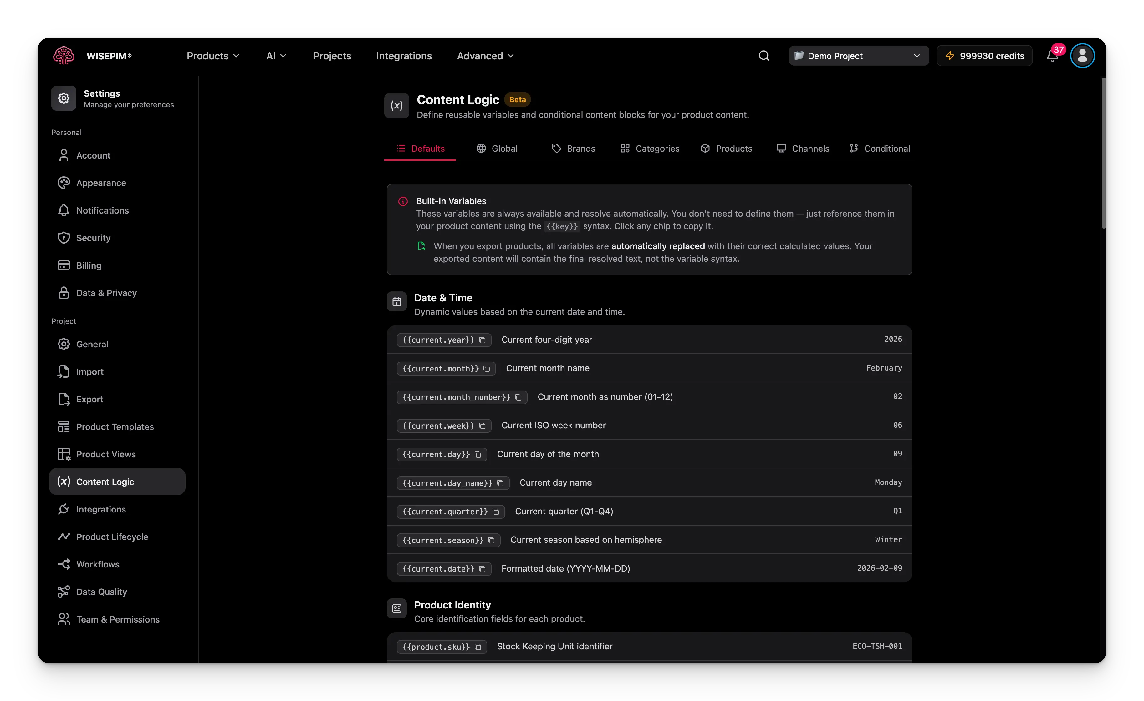Don't just use variables for exports -- use them to guide the AI. Inject {{brand.tone}}, {{category.benefits}}, and {{product.specs}} directly into your WISEPIM Prompt Library to generate hyper-personalized AI content at scale.