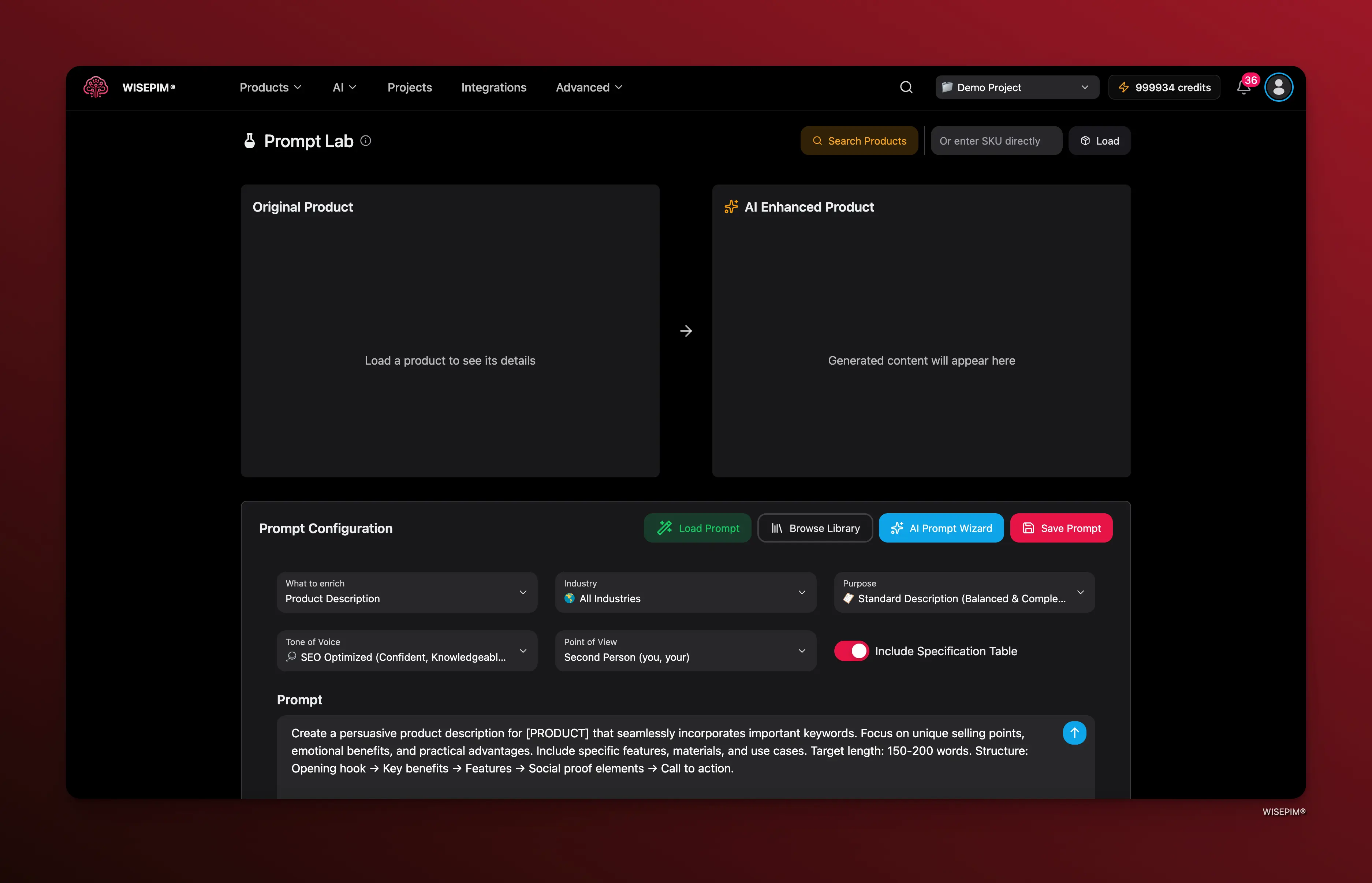 Pick any product from your catalog and load it into the Prompt Lab to experiment with different AI enrichment strategies.