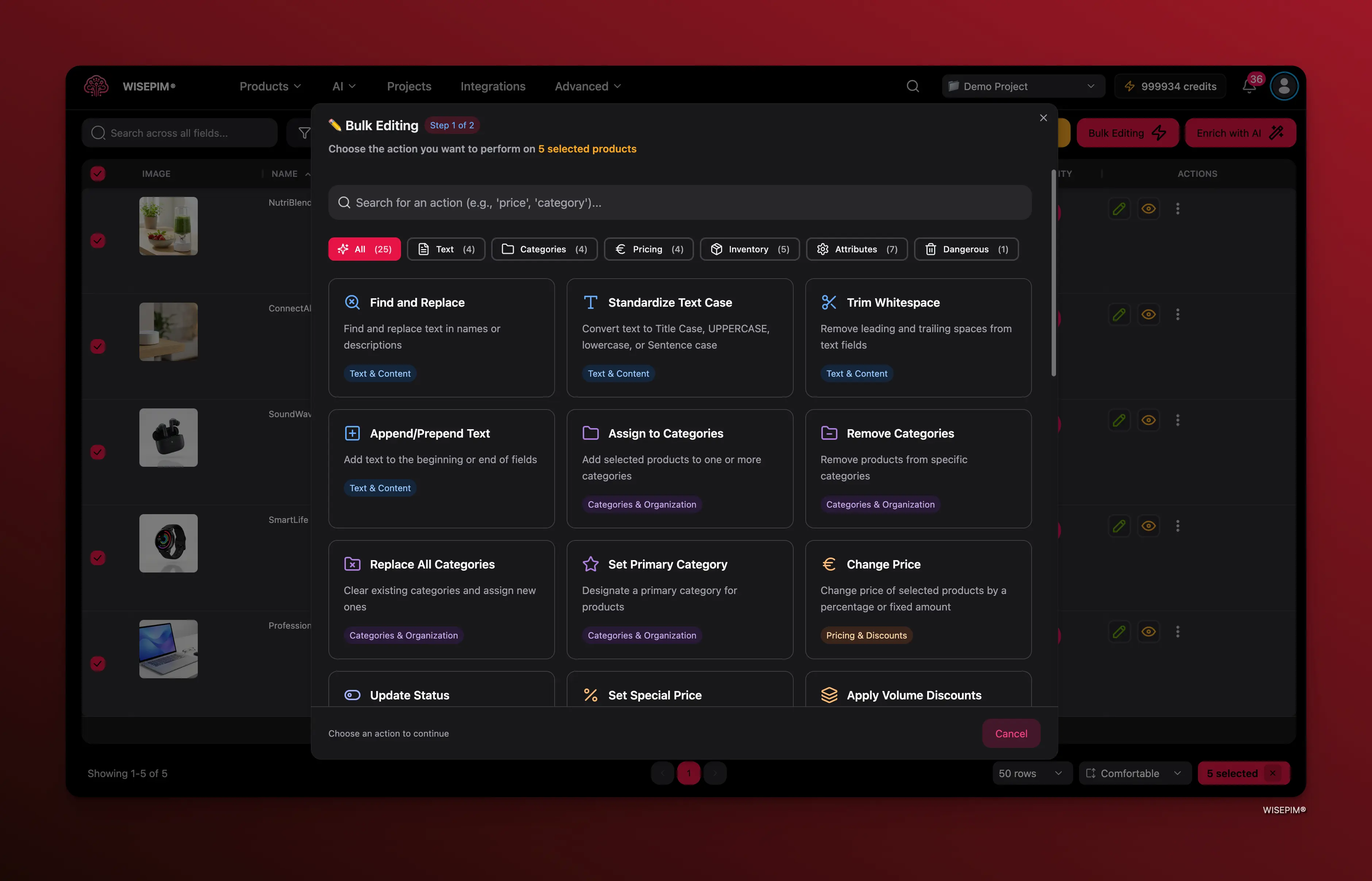 Update, import, export, and modify thousands of products with single operations. One person handles enterprise workloads.