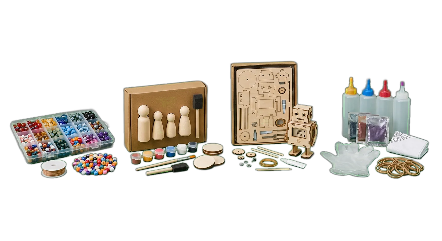 Kits that bundle multiple items for a complete project belong in a Kits subcategory within their craft discipline. Individual supplies (paint, yarn, tools) are categorized by their specific type. This distinction matters because kits and individual items have different attribute requirements, pricing models, and customer intent.